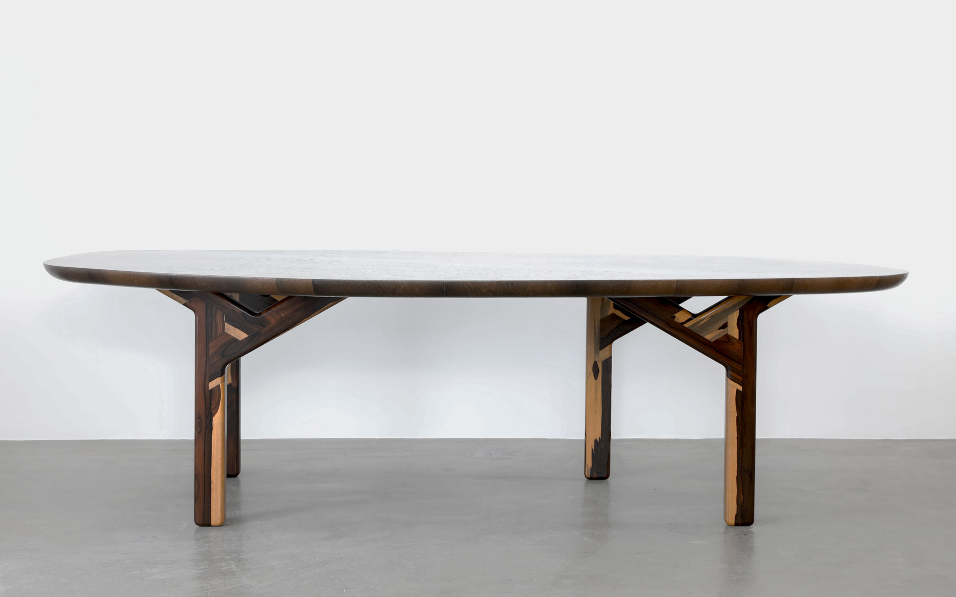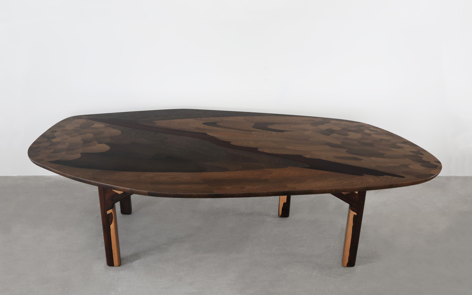 Le plateau de la table est un chef-d’oeuvre, il faut lui donner des pieds à la hauteur. Pour des raisons techniques les pieds doivent être réalisés en bois massif sans la richesse de la marqueterie.Il faut cependant évoquer l’organique des pattes de l’oiseau. Il existe un bois rare et précieux qui apporte cette impression de vivant : Le Ziricote et son veinage spectaculaire. Vendu au poids, difficile à trouver dans de grandes dimensions, c’était pourtant un choix évident.